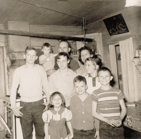 Elizabeth Eaton Wise family in the kitchen of the Eaton Home. Front row (l to r): Jewel, Dow, Doug.